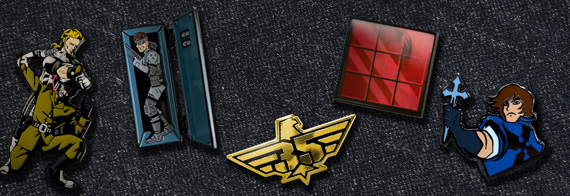 Meanwhile, the Metal Gear Solid Mechanical Pin Collection embraced an industrial design aesthetic, multi-layered metal textures, gear-inspired cutouts, and subtle nods to in-game iconography such as the FOXHOUND emblem. The pins were engineered with movable parts, demonstrating how custom video game pin design can merge mechanical innovation with collectible storytelling.